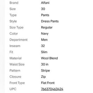 Men's Alfani Slim Fit Navy Stripe Stretch Fabric Flat Front Sz 30X32 $135.00