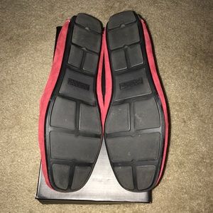 These red suede loafers are in perfect condition only worn once. The pictures don't do the suede justice, it is very soft and more of a darker red than in the pictures. They are a men's size 12 and fit true to size.