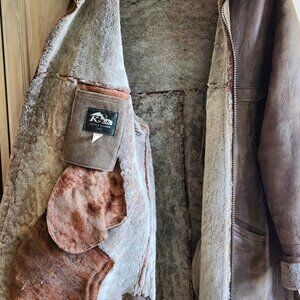 I'm selling a preowned vintage 100% leather/shearling, men's long jacket that is in beautiful vintage shape. The suede is a chestnut brown color, worn to a nice patina with a shearling lining. Pockets are also of pure leather and includes a security pocket in the upper left chest with a zipper closure. The front jacket closure is with a two way heavy duty zipper. Collar is open or stand up for really cold wind and weather. The overall chest size is 52 inches diameter. Sleeve length is 26 inches with cuffs rolled up. Length of jacket is 33 inches. This jacket has been lovingly worn and has many years left in its life.
