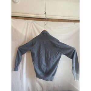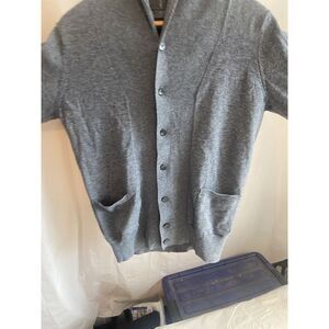 This sweater is 55% cotton 45% Morano wool. This cardigan is absolutely awesome. Is a beautiful blue gray heathered style high neck sweater with bluish gray buttons down the front. There does not appear to be any stretching around the cuffs or the waist. The sweater is soft and lightweight and make a beautiful gift for any man.