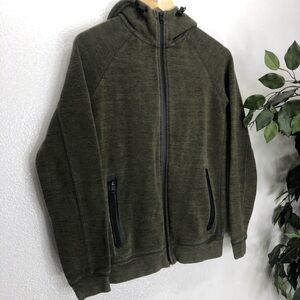 A mens super cozy zip hoodie made of pretty heavy but still kinda thin material. Zipper pockets and the front zipper goes all the way up keeping your neck warm. Stretchy draw strings with stopper. Perfect for fall weather