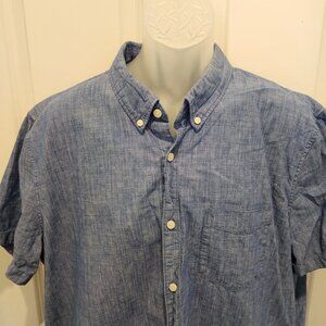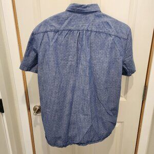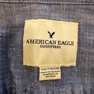 This is a Men's American Eagle Button Down Short Sleeve Shirt in size XXL. The shirt features a collared neckline with a button-down closure and a blue color made from cotton material. It has a regular fit with short sleeves, making it suitable for various occasions such as travel, parties, casual wear, workwear, or business settings. The shirt is machine washable and has accents of buttons and pockets, making it easy to care for and versatile for all seasons including summer, fall, and spring.