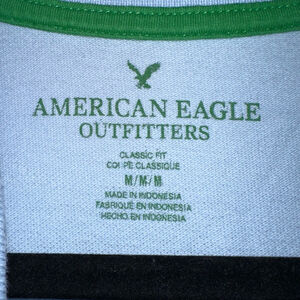 Pre-owned American Eagle Outfitters men's Classic Fit polo shirt in light blue. Size M/M/M. Features a green embroidered logo and green interior neck trim. Made in Indonesia. The shirt is constructed from a cotton pique material. Measurements are not provided. The polo shows no significant flaws; however, it is pre-owned and may have minor signs of wear consistent with use.