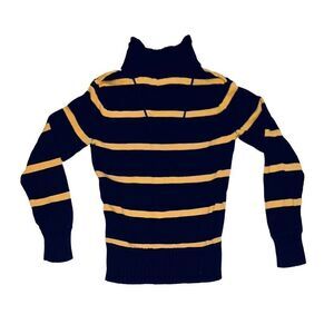 This American Eagle Outfitters sweater is a stylish addition to your wardrobe. With a tight-knit and striped pattern, this long-sleeved 1/4 zip pullover is perfect for casual occasions. The collar adds a touch of formality, while the navy blue and yellow stripes with small chest logo accent give it a unique character.