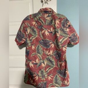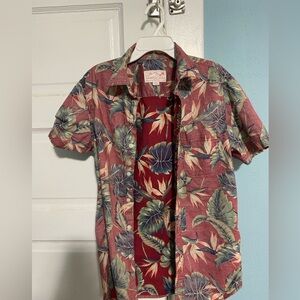 A perfect shirt for your summer backyard barbecue! This is a classic Hawaiian style button down with muted reds and floral leaf patterns.