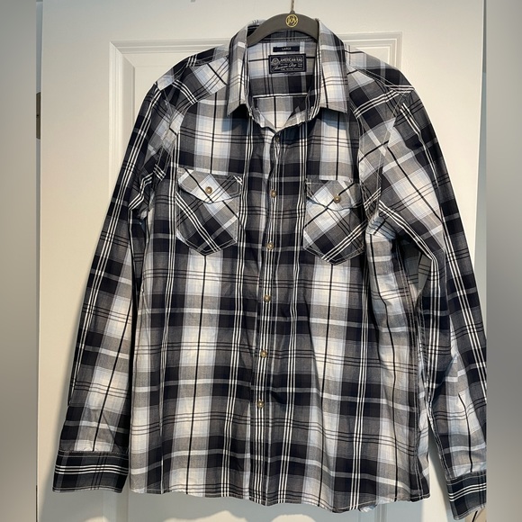 Size Large American Rag button up with black white and light blue stripes pattern. Great condition. Perfect for a night out or to wear to a business casual office.