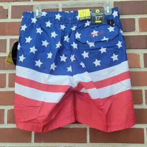 NWT!!! American flag printed Razor swim shorts made by Body Glove. Size S. 17" length. Back pocket with velcro enclosure. Quick dry. Also has a key loop. Elastic waistband with black tie to secure. Has side pockets. Originally $55!!!