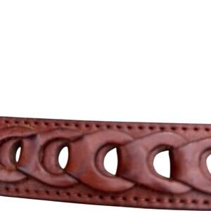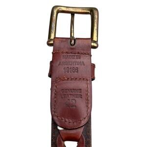 This woven leather belt is made in Argentina and has a rich patina. 1 1/4” wide, with a brass buckle. It looks to be hand tooled, but there is no written indication of that on the belt. Size 42.