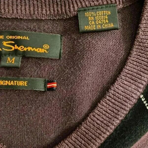 This is a Ben Sherman pull over V-neck sweater. It is a handsome Argyle print of black and purple. There are no stains or rips that I’m aware of. It has been gently used and I have the measurements in the pictures. Let me know if you have any questions and thank you for considering my item.