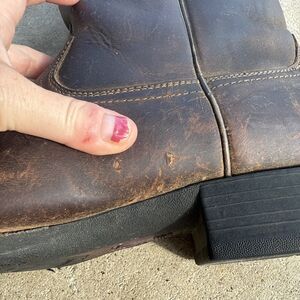 Men's Ariat Heritage Roper Western Cowboy Boot, size 12D, pull on. Dark oiled leather. Very good preowned condition with scuff/scratches to leather upper and a couple of marks on outsole. Please see all photos for closeups of these areas.