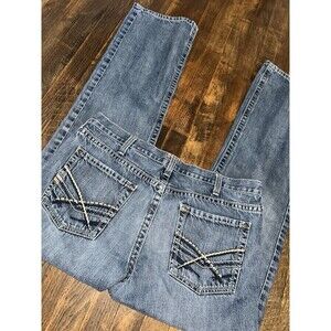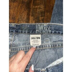 The product is a pair of men's Ariat jeans in size 38 with a straight fit and 36-inch inseam. The jeans come in a classic blue color and are designed for regular size men. With the Ariat brand known for quality and durability, these jeans offer both style and comfort for everyday wear.