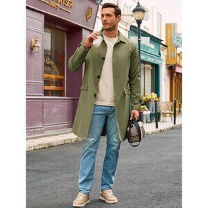 Mens Army Green Slim Fit Single Breasted Long Windbreaker Jacket Trench Coat