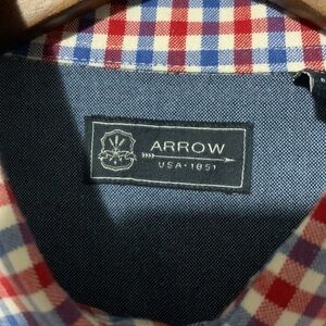 Men’s Arrow blue and red checkered plaid button-down shirt. 30” from top to bottom. Perfect shirt for July 4th and can continue to wear. Made in the U.S.A.