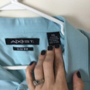 Gently used button up dress shirt. Light blue color. Axist size XXL, slim fit. No holes or stains. Smoke free home.