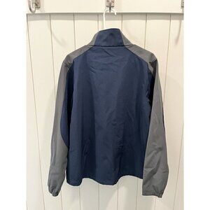 Men's Medium Black Diamond Soft Shell Zip Up Jacket. 92% Polyester, 8% Spandex. Features Navy + Gray colors. Three zip up pockets included.