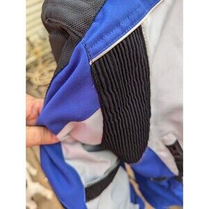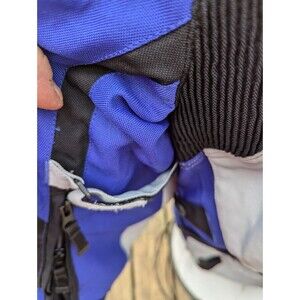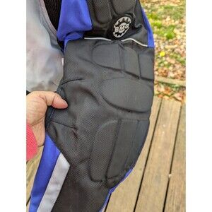 Made by British Motorworks. This jacket is very much intended for you bikers. It is amazing! Heavily padded forearms, shoulders. Cushioned neck drawstring bottom, hook and loop belted area and multi pockets. Numerous adjustable sections all over the jacket to allow one to fit it close to the body..I tried to photograph as many as I could but this coat shows no damage. I do think it is missing a second either vest or lining because there is a secondary zip inside. The chest measures 54" around with a length of 28". The back also feature padding with pouches as well and zippers to allow some ease across the hips as you ride. My hubby is a Harley guy and he seemed to think this was more for the speed type bikes I r racing bikes. It provides some very needed protection in case of a crash, God forbid!