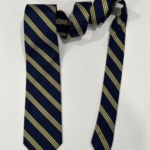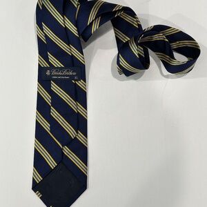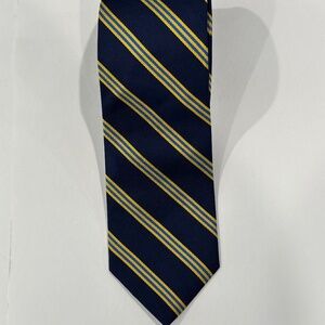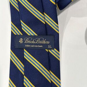 Men's BROOKS BROTHERS classic neck tie featuring a pointed tip, an adjustable fit and stripe print throughout. Color: navy blue & yellow.