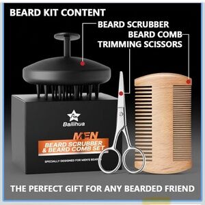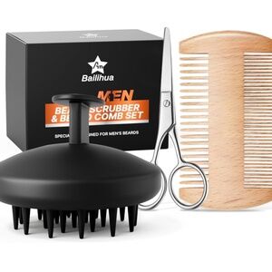 Beard Scrubber Brush Kit- 3 Piece Professional Set Silicone Beard Brush Scalp Shower Shampoo Scrubber Brush, Trimming Scissors, Dual-Sided Beard Comb | Hair Face Exfoliator & Massager for Growth(10$)