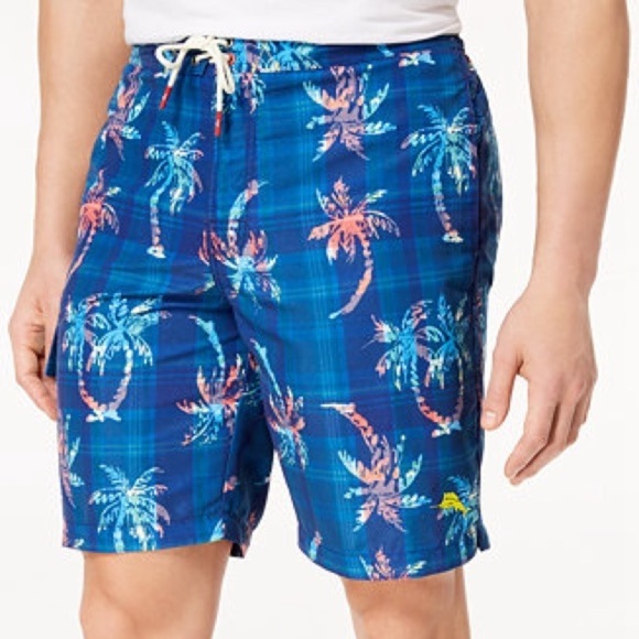 Make your poolside style pop with these Baja Palm Illusion twill swim trunks from Tommy Bahama, featuring a comfortable classic fit finished with a crisp plaid and tropical palm trees printed in vibrant, attention-grabbing tones.