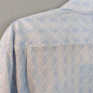 Men's Banana Republic button down dress shirt is 100% cotton and features a white background with a light blue allover geometric medallion design. Classic and understated yet interesting. Perfect for work, school, office, or a night out. Button front, cuffs and collar button as well. In excellent condition. Size XL, see pictures for measurements.
