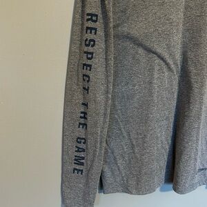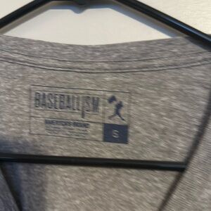 Mens Baseballism “Respect the Game” Long Sleeve Tee Shirt in gray with navy. Item is in excellent condition and comes from a smoke free home. Size small.