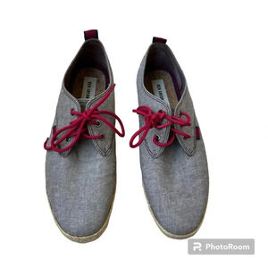 Gray canvas shoe with a comfy barely there feel. Round toe. Twill chambray construction. Braided jute trim midsole. Lace Vamp closure. Grip sole. Very trendy espadrille detail. Perfect for everyday day wear or casual night out.