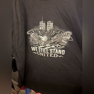 "Get ready to ride with pride in this bold, black t-shirt. The striking white graphic features a fierce eagle and the iconic Twin Towers, paying tribute to the 20th anniversary of 9/11. The 'We Still Stand United' slogan is a call to action, reminding us to stay strong and united in the face of adversity. Made for the open road, this tee is perfect for bikers who live for freedom and patriotism. Show your spirit and hit the highway in style."