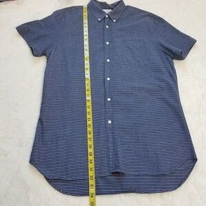 A men's shirt by native youth featuring blue and gray striped, this elegant shirt has a button through placket, button down collar and is finished with a front pocket, standard fit, short sleeve button-down shirt, extra buttons, 100% cotton, size large.