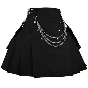 The Gentry Choice Utility Kilt in black is a bold fusion of traditional men’s kilts and modern fashion. Made from durable 10oz cotton fabric, this stylish black utility kilt delivers comfort, strength, and a sharp statement. Featuring silver metal chains and functional cargo kilt pockets, it's perfect for festivals, themed events, weddings, or everyday wear.