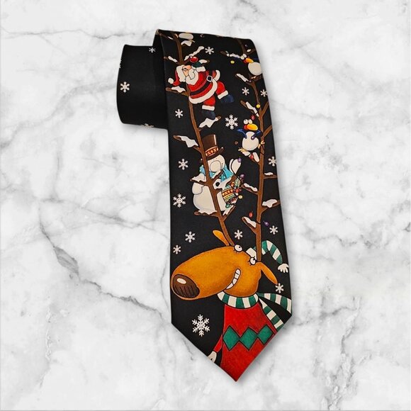 Men’s Black Christmas Novelty Tie Santa Snowmen & Reindeer Holiday Design