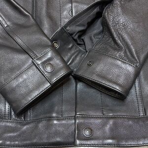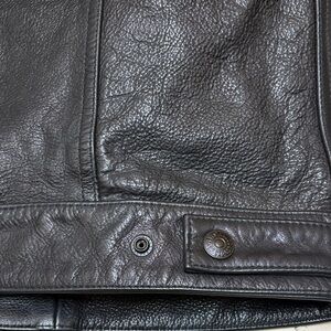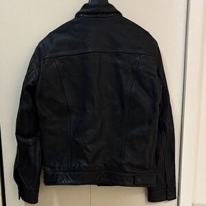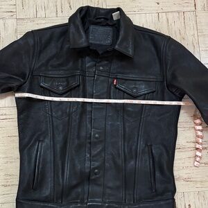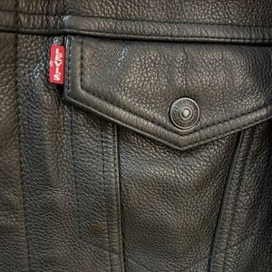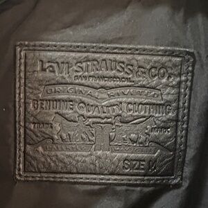 Levi’s Men’s Leather Trucker Jacket. Stylish, cruelty-free alternative to classic leather. Designed with a timeless trucker silhouette. Texture faux leather finish for a rugged, two chest snap pockets and two lower welt pockets. Adjustable button cuffs and waist tab for a personalized fit. Perfect for any occasion. Length : 25”, chest 21” Nice and Clean. LIKE BRAND NEW