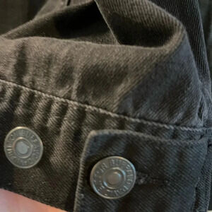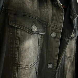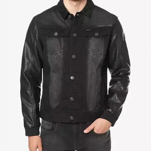 Buffalo David Bitton black, denim jacket, black wash, jeans faux leather , sleeves, side pockets, two chest flap pockets, cool patch on one sleeve size extra large