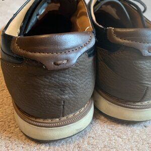 Gently worn for band concerts. Size 9.5 Mens. Two-toned dress casual shoes. Black leather and thick canvas-type material, with brown leather accents.
