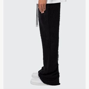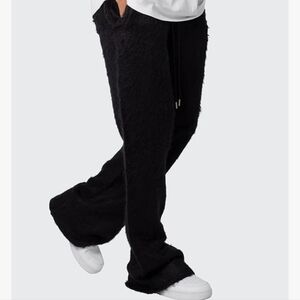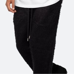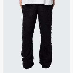 the Fuzzy Sweatpants are constructed in a a custom acrylic sweater knit. The pants feature an elasticized waist in self fabric, pockets at the outseam, a tonal drawstring, and is finished with brushing on the outside to provide a fuzzy texture.