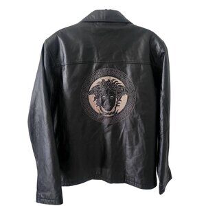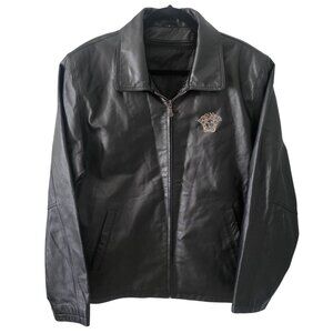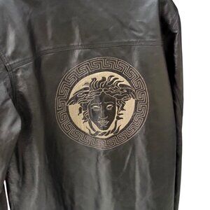 A sleek leather jacket with Medusa embroidery, adding a bold designer touch. Features a zip closure and two front pockets.