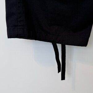 Zip and button closure, 2 pockets each side, draw strings at ankles