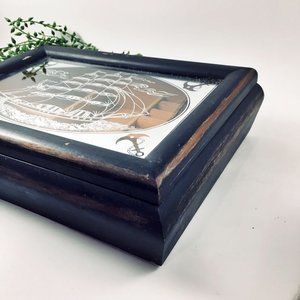 Men's Black Nautical Jewelry Box Painted Wood Sailing Ship Glass Top Mirror Prim