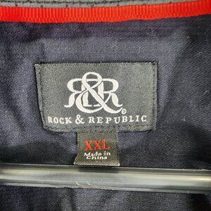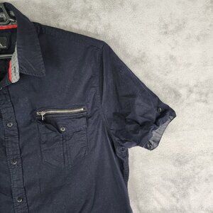 Rock & Republic men's shirt featuring short sleeves, zipper pockets, and stretch fabric for a comfortable fit. Ideal for casual or semi-formal occasions.