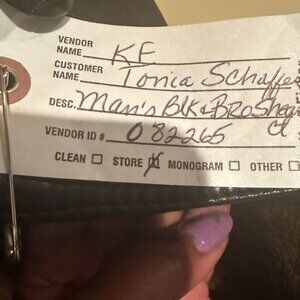 Full-length black shearling coat with brown lamb wool lining, two pockets, and a high collar. Originally purchased at Marshall Fields Store for Men in the Water Tower. Size 40. It is also perfect for Women. Original buttons, 51 inches long, just picked up from cold storage.