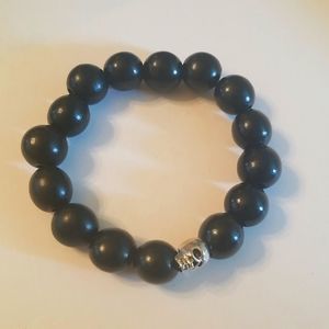 Mens Black Wooden Beaded Expansion Bracelet W/Silverplated Skull New Custom Made