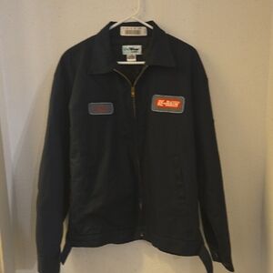 Durable men's work jacket in classic navy. has paint smudge on back. measures approx 26" pit to pit. no stretch.