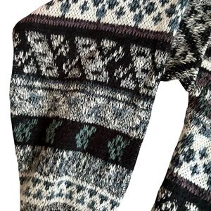 Step into retro style with this vintage Expressions knit cardigan sweater, made in Korea. The sweater features a classic black, gray, and cream Fair Isle geometric pattern with subtle green accents, a button-up front, and ribbed cuffs and hem. The oversized fit and timeless design make it perfect for both men and women who love cozy, vintage-inspired fashion.