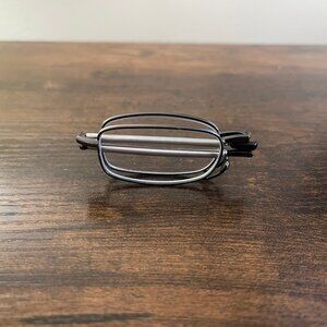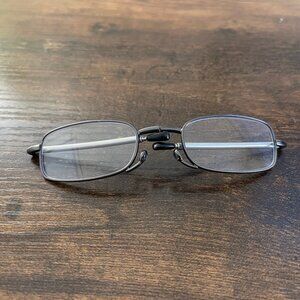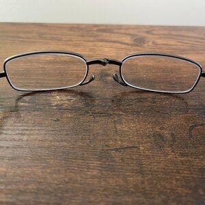 These black and silver rectangular eyeglass frames are pre-owned and in good condition. The frames show minor surface wear consistent with normal use, but there are no cracks, breaks, or structural issues. Hinges open and close smoothly, and the nose pads are intact and comfortable. Overall, these stylish rectangular eyeglass frames remain durable, functional, and ready to wear. FRAMES ONLY. LENSES MUST BE REPLACED. This item has been cleaned and tested.
