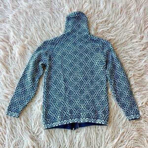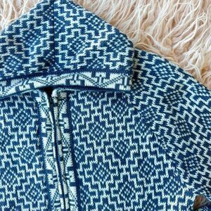 Stay stylish and warm with this blue geometric zip-up sweater. Perfect for any casual outing.
