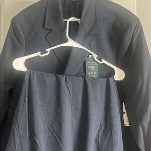 Elegant men's blue pinstripe suit jacket. Ideal for business or formal events.