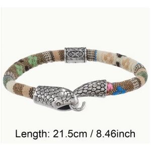 This bracelet has a rope with stripes in shades of blue and other colors. It has a metal snake head at one end that hooks to the metal snake tail at the other end.