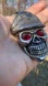 Silver skull pendant necklace featuring striking red eyes. Unique and bold design.