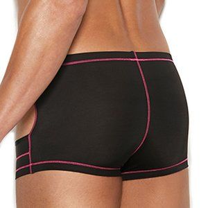 Men's boxer brief with cut out sides and contrast hot pink stitching. Black and hot pink. New in package. 87% Polyester/13% Spandex.