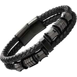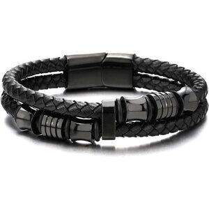 Mens Braided Leather Bracelet Double Row Bangle Wristband Stainless Steel Black