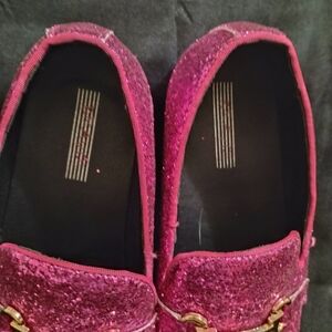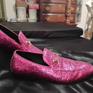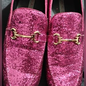 Stand out with these dazzling pink glitter loafers, perfect for making a bold statement. The gold accents add a touch of elegance to your ensemble.